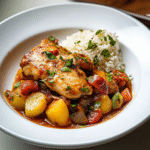 Pollo guisado is a heartwarming, traditional dish featuring tender chicken simmered in a savory sauce rich with garlic, cumin, and fresh herbs. This flavorful meal evokes cherished memories of family gatherings and celebrations, making it perfect for both casual weeknight dinners and festive occasions. Its vibrant colors and comforting aromas are sure to entice everyone at the table.